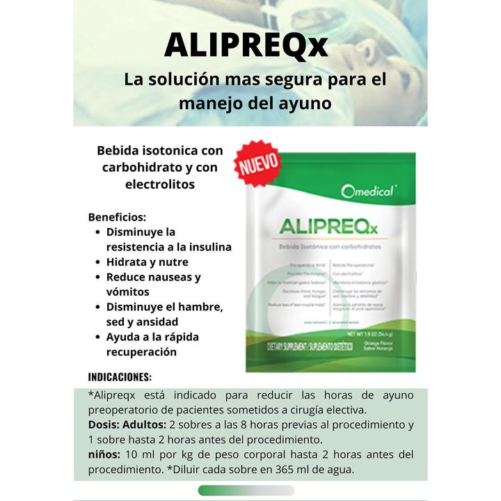 Bebida isotónica con carbohidratos y electrolitos, solución metabólica para el manejo del ayuno preoperatorio, orientada a reducir el estrés quirúrgico y optimizar la respuesta del paciente, disminuyendo síntomas de sed, hambre y debilidad. (Ya no puse lo que contiene porque eso pueden poner una foto con la etiqueta nutricional, así como los otros productos)